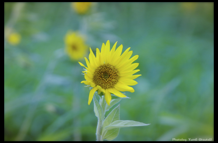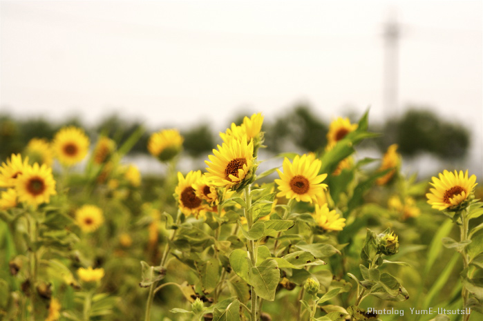 直射日光で黄色く輝くヒマワリを撮りながら、